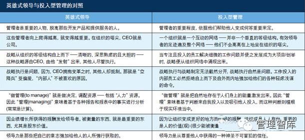 如何把一個作為“人力資源”組合集體的公司,變成由一個又一個活生生的“人”構(gòu)成的社群的機(jī)構(gòu)?換句話說,如何把英雄式領(lǐng)導(dǎo)變成投入型管理(這兩者的區(qū)別,請參見表“英雄式領(lǐng)導(dǎo)與投入型管理的對照”)?