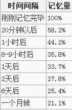 這條曲線告訴人們?cè)趯W(xué)習(xí)中的遺忘是有規(guī)律的,遺忘的進(jìn)程不是均衡的,不是固定的一天丟掉幾個(gè),轉(zhuǎn)天又丟幾個(gè)的,而是在記憶的最初階段遺忘的速度很快,后來就逐漸減慢了,到了相當(dāng)長(zhǎng)的時(shí)候后,幾乎就不再遺忘了,這就是遺忘的發(fā)展規(guī)律,即"先快后慢"的原則。觀察這條遺忘曲線,你會(huì)發(fā)現(xiàn),學(xué)得的知識(shí)在一天后,如不抓緊復(fù)習(xí),就只剩下原來的25%)。隨著時(shí)間的推移,遺忘的速度減慢,遺忘的數(shù)量也就減少。有人做過一個(gè)實(shí)驗(yàn),兩組學(xué)生學(xué)習(xí)一段課文,甲組在學(xué)習(xí)后不久進(jìn)行一次復(fù)習(xí),乙組不予復(fù)習(xí),一天后甲組保持98%,乙組保持56%;一周后甲組保持83%,乙組保持33%。乙組的遺忘平均值比甲組高。