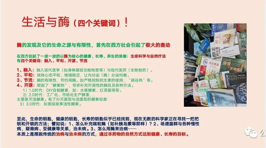 從生命的活力角度,原來是不同酶在起作用,什么免疫力、抵抗力只不過是酶的分解催化能力而已。難怪檢查身體功能如肝功能等等不過是檢查酶的情況。中醫(yī)的“不通則痛”,原來也是因為缺少酶的分解與活性,堵塞了,缺酶成為萬病之源??股貧⒉凰啦《荆軞⑺酪恍┟庖吡?。