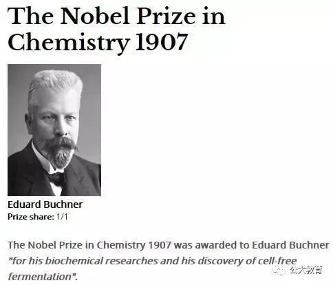 1907年:愛德華·比希納(德國)因發(fā)現(xiàn)無細(xì)胞發(fā)酵現(xiàn)象諾貝爾化學(xué)獎獲獎?wù)撸?/span>