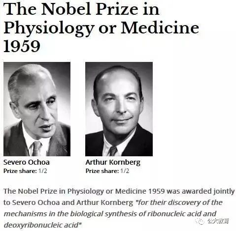 奧喬亞發(fā)現(xiàn)RNA合成所需的多核苷酸磷酸化酶,獲得1959年諾貝爾生理學(xué)醫(yī)學(xué)獎。