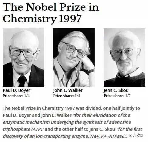 1997年: 保爾·博耶(美國),約翰·沃克(英國),科斯(丹麥)因ATP合成酶作用機(jī)理的發(fā)現(xiàn)獲得該年度諾貝爾化學(xué)獎。