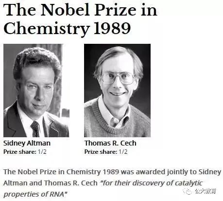 1989年: 發(fā)現(xiàn)四膜蟲RNA可進(jìn)行自我剪接從而證明酶也可以是RNA的切赫,以及發(fā)現(xiàn)RNase P中的RNA分子是酶活性中心一部分的奧爾特曼,分享了該年度的諾貝爾化學(xué)獎。