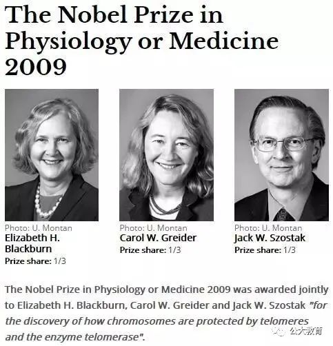 2009年: 伊麗莎白·布萊克本(美國),卡羅爾·格雷德(美國),杰克·紹斯塔克(美國)因發(fā)現(xiàn)端粒和端粒酶保護(hù)染色體的機(jī)制諾貝爾生理學(xué)或醫(yī)學(xué)獎獲獎?wù)摺?/span>