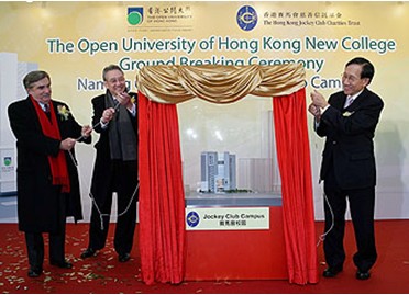 公開大學獲香港賽馬會慈善信托基金捐款2億70萬元,其中1億9000萬元為新學院的建筑經(jīng)費,余下1070萬元用以發(fā)展一項為期五年的「賽馬會小區(qū)健康教育計劃」。公開大學分別把新學院的校園及新大樓的綜藝廳命名為「賽馬會校園」和「賽馬會綜藝廳」,以感謝香港賽馬會慈善信托基金的捐助。