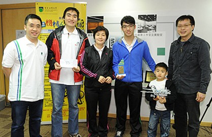 圖一:公開大學(xué)校董譚偉豪博士(右一)和校友兼義務(wù)導(dǎo)師邱嘉?。ㄗ笠唬?/SPAN>, 將家庭組冠軍獎(jiǎng)牌頒給校友捐款人陳健興(左二)與其家人。