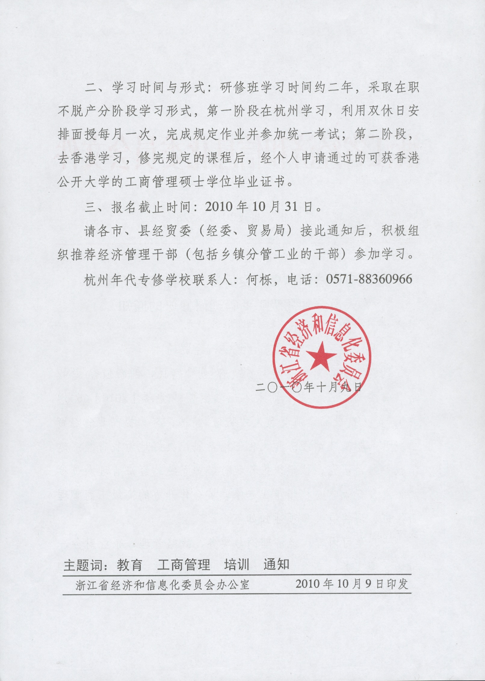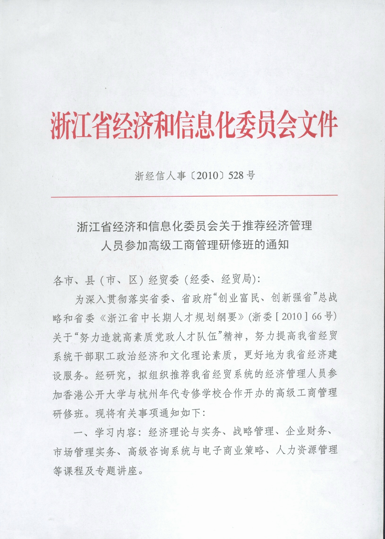 浙江省經(jīng)濟(jì)和信息化委員會關(guān)于推薦經(jīng)濟(jì)管理人員參加高級工商管理研修班的通知