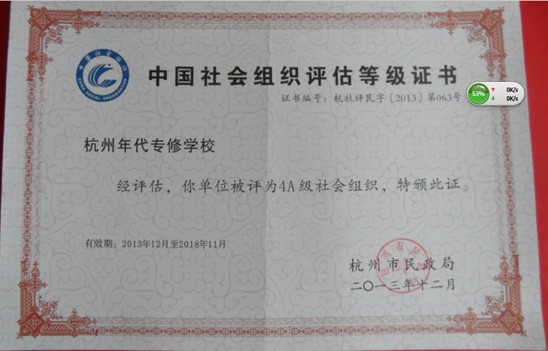 根據(jù)《社會(huì)組織評(píng)估管理辦法》(民政部令第39號(hào))和社會(huì)組織評(píng)估的相關(guān)規(guī)定,進(jìn)一步加強(qiáng)我校的信用建設(shè)及自治自律能力,我校參加了2013年度社會(huì)組織評(píng)估工作,經(jīng)過(guò)第三方嚴(yán)格的實(shí)地評(píng)估以及區(qū)民政局、市民政局層層審核,我校榮獲2013年度杭州市民政局社會(huì)組織等級(jí)評(píng)估4A級(jí)榮譽(yù)證書(shū)。