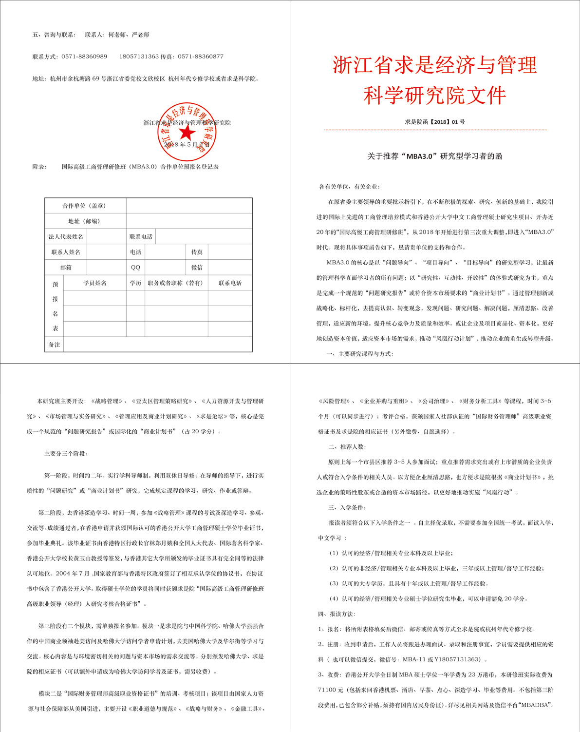在原省委主要領(lǐng)導(dǎo)的重要批示指引下,在不斷積極的探索、研究、創(chuàng)新的基礎(chǔ)上,我院引進(jìn)的國(guó)際上先進(jìn)的工商管理培養(yǎng)模式和香港公開(kāi)大學(xué)中文工商管理碩士研究生項(xiàng)目、開(kāi)辦近20年的“國(guó)際高級(jí)工商管理研修班”, 從2018年開(kāi)始進(jìn)行第三次重大調(diào)整,即進(jìn)入“MBA3.0”時(shí)代?,F(xiàn)將具體事項(xiàng)函告如下,懇請(qǐng)貴單位的支持和合作。