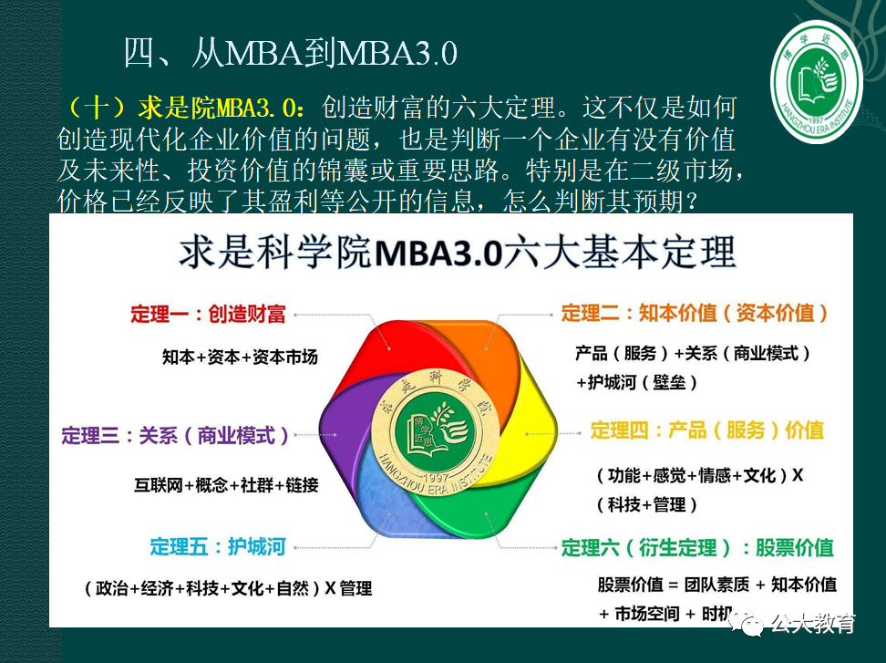現(xiàn)在, MBA3.0/DBA3.0早就輕松地回答了這個問題。求是科學院還注冊了知識產(chǎn)權(quán),其中還包含六個基本定理。我們的學生和校友每年都在實踐著這些定理,不斷為社會創(chuàng)造著價值。迄今為止,已經(jīng)創(chuàng)造了超過100家上市公司,同時造就了很多管理億萬、數(shù)十億、甚至數(shù)百億及以上財富的社會精英。