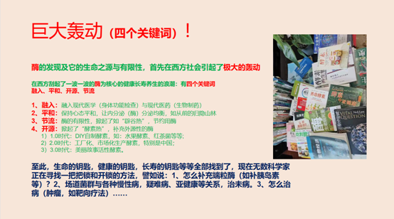 活性酵素是酶的統(tǒng)稱,何校長(zhǎng)從生命的奧秘,到酶的發(fā)現(xiàn)及發(fā)現(xiàn)以后給西方知識(shí)分子界帶來的巨大轟動(dòng),大致上可以用四個(gè)關(guān)鍵詞來概括:“節(jié)流”、“融入”、“平和”、“開源”。