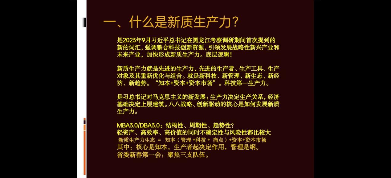 何校長進一步從什么是經(jīng)濟與經(jīng)濟發(fā)展?什么是管理?以及經(jīng)濟的結構性、周期性、趨勢性,到經(jīng)濟發(fā)展的高質量、高效率,新質生產(chǎn)力及戰(zhàn)略性新興產(chǎn)業(yè)與未來性產(chǎn)業(yè)的概念、特點、底層邏輯,新質生產(chǎn)力及生態(tài)等方面進行了詳細的展開,并介紹了戰(zhàn)略性新興產(chǎn)業(yè)與未來性行業(yè)與技術的新技術,新管理發(fā)展的一些具體情況。