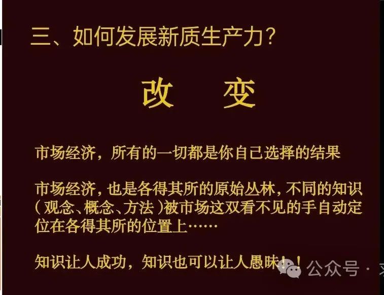 邏輯非常簡單,既然是“質”的改變,就是不同于傳統(tǒng)的思路、傳統(tǒng)的觀念、傳統(tǒng)的方法。非常需要通過學習與培訓等,提升看得到(觀念)、講得出(概念)、做得好(科學方法)新質生產(chǎn)力等的知識與能力,才能成就一桌桌“新質生產(chǎn)力"的“大餐”。否則,無論多么先進的生產(chǎn)工具與生產(chǎn)對象等等,燒出來的可能還是傳統(tǒng)經(jīng)濟的格局;或者是穿新鞋走老路,實現(xiàn)不了新質生產(chǎn)力帶來的高效率、高質量。只有勞動者有“質”的改變,才能推動新質生產(chǎn)力的全面發(fā)展,構成整個社會高質量發(fā)展的新生態(tài)。象當初“千家萬戶促翻番”那樣,使我們整個社會的經(jīng)濟結構有質的改變,走出一條中國特色的獨特道路。
