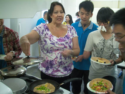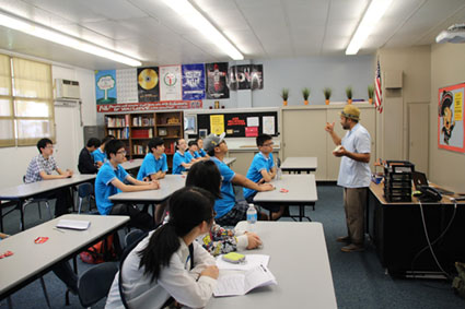 經(jīng)過十多個小時的長途飛行,學(xué)員們首先來到了此次游學(xué)的第一站—洛杉磯。在短暫的休整后,學(xué)員們來到了位于洛杉磯近郊的橙木學(xué)院(Orangewood Academy),集中學(xué)習(xí)了ESL培訓(xùn)課程(English as Second Language Class),包括美國地理、宗教、歷史、戲劇、烹飪、計算機和音樂等。在這里,學(xué)員們第一次親身感受了美式教育的開放與自由,同時被美國老師的友好和熱情所深深打動。比如,在戲劇課上,學(xué)員們隨意盤坐在教室的地毯上,聽著戲劇老師對短劇《Little Red》的講解,然后和老師、志愿者一起趴在地上動手制作短劇需要的道具。在為期一周的時間里,學(xué)員們與當(dāng)?shù)鼐用窠Y(jié)對,紛紛住進了美國人的家中,感受到了更為地道的美國家庭生活。在寄宿家庭里,美國家長有的向?qū)W員展示家中收藏的福特老爺車,有的不辭辛勞的長途驅(qū)車,帶著學(xué)員去洛杉磯海灘散步,有的臨時充當(dāng)起學(xué)員的口語老師,指導(dǎo)學(xué)員在看到沿途風(fēng)景時,如何用更地道的英語表達。而我們的學(xué)員們也不忘禮尚往來,熱心的教起“爸爸”“媽媽”們中國話;廚藝自信者,更是系上圍裙,直接給“爸爸”“媽媽”來了幾個地道的中國菜。