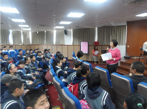 2月1日,團(tuán)員們一行前往姐妹學(xué)校-天母國(guó)中訪學(xué)交流。在志愿者的帶領(lǐng)下,團(tuán)員們首先參觀了天母國(guó)中的教室、圖書館、游泳館等設(shè)施。交流會(huì)上,校弦樂(lè)隊(duì)的隊(duì)員們?yōu)閬?lái)賓送上了美妙的合奏。而后出場(chǎng)的兩名同學(xué)又以插科打諢的方式將學(xué)校的歷史沿革、教學(xué)特色娓娓道來(lái),聽的臺(tái)下的同學(xué)忍俊不禁……默劇表演、相聲、互動(dòng)競(jìng)猜、交換禮物,整個(gè)交流會(huì)上充滿了兩岸學(xué)生的歡聲笑語(yǔ)。