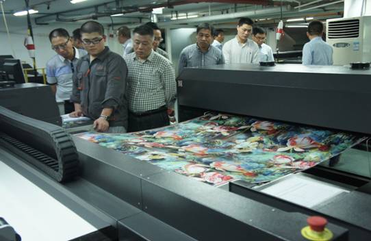 在蔣主任的精心安排下,在科技局的陳福清科長的陪同下,學(xué)員們首先來到了杭州宏華數(shù)碼科技股份有限公司,這是一家專業(yè)從事數(shù)碼噴印技術(shù)與設(shè)備的研發(fā)、生產(chǎn)、銷售與服務(wù)支持的高新技術(shù)企業(yè)。目前其產(chǎn)品和解決方案主要應(yīng)用于紡織、印染、廣告、家居、個(gè)性化設(shè)計(jì)等相關(guān)領(lǐng)域,研發(fā)及技術(shù)實(shí)力已達(dá)到國際領(lǐng)先水平。工作人員為我們學(xué)員介紹了公司的現(xiàn)狀和發(fā)展概況,并帶領(lǐng)學(xué)員參觀了數(shù)碼印花車間、觀看了印花的過程,如同彩色打印機(jī)一般,白色的絲綢穿過打印機(jī)后,就變成了五彩斑斕的圖畫,很神奇。