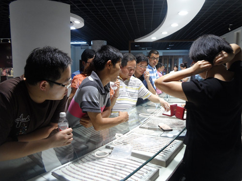 享受了豐盛的午餐,許老師帶領我們參觀了珍珠飾品展示廳,介紹了阮氏集團的發(fā)展歷程。阮仕集團始創(chuàng)于1988年,是一家從事珍珠養(yǎng)殖、加工、設計、銷售、科研為主業(yè),涵蓋房地產、生物制藥、科研創(chuàng)新、基礎教育等多個領域,進行多元化發(fā)展。近年來,集團發(fā)展迅速,被福布斯商務周刊評選為“中國潛力百強”。阮仕珍珠作為集團的核心部分,堅持“高亮澤珍珠”和“國際化設計”,完美呈現珍珠的光華之美,先后榮獲“中國名牌”、“中國珠寶首飾行業(yè)馳名商標”、“中國馳名商標”。在2013年3月底,阮仕珍珠作為“國禮”隨習近平主席出訪,贈送坦桑尼亞總統(tǒng)夫人。珍珠項鏈充滿女性氣質。珍珠可以襯托女性儀態(tài)的優(yōu)美,又低調得恰到好處,還可以給人一種冷靜、智慧的感覺。在阮仕珍珠純凈、優(yōu)雅的魅力下,學員們也不禁紛紛購買珍珠作為父親節(jié)禮物贈送家人。與家人一起分享珍珠的柔和之美,滿心歡喜。參觀之旅時間如此之短暫,收獲卻是頗為豐富。