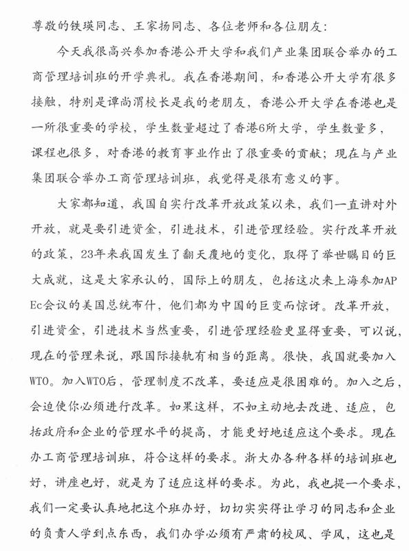 2001年10月28日,張浚生書(shū)記在我校與香港公開(kāi)大學(xué)的國(guó)際高級(jí)工商管理研修班(MBA)開(kāi)學(xué)典禮上的講話